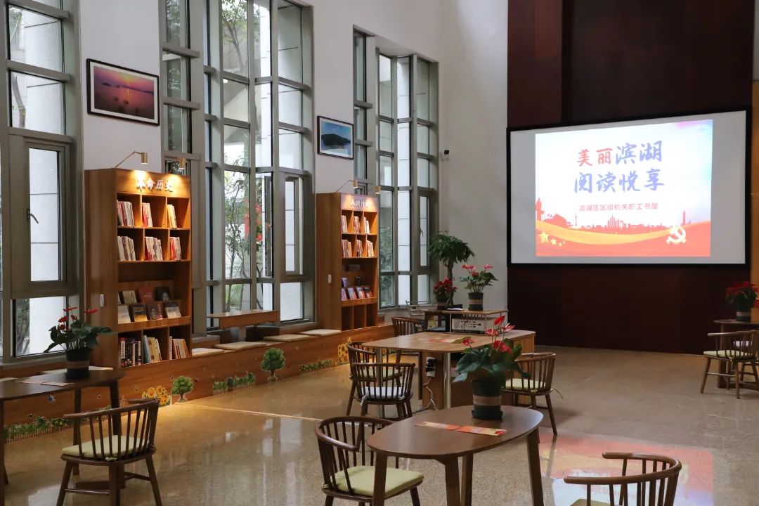 为满足机关职工多样化阅读需求,营造滨湖阅读悦享的良好氛围,在区总工会的大力支持下,2019年10月,区级机关工委(区级机关联合工会委员会)在区行政中心3号楼裙楼1楼建成以“美丽滨湖、阅读悦享”为主题的职工书屋。书屋藏书5000余册,涵盖中国革命史、党建理论、法律法规、经济理论、城市建设、流行文学、办公工具等七大类别。提供主题读书沙龙、阅读拓展活动策划、组织等服务。