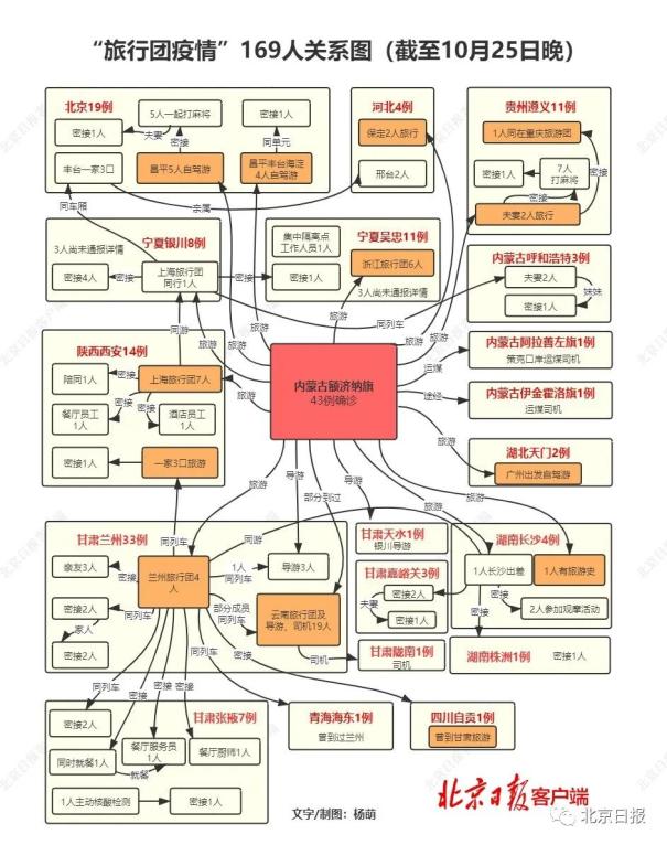 除内蒙古二连浩特的14名病例,和河北石家庄的1名病例尚未找到源头外,其余阳性病例都直接或间接与内蒙古额济纳旗相关,累计169人。