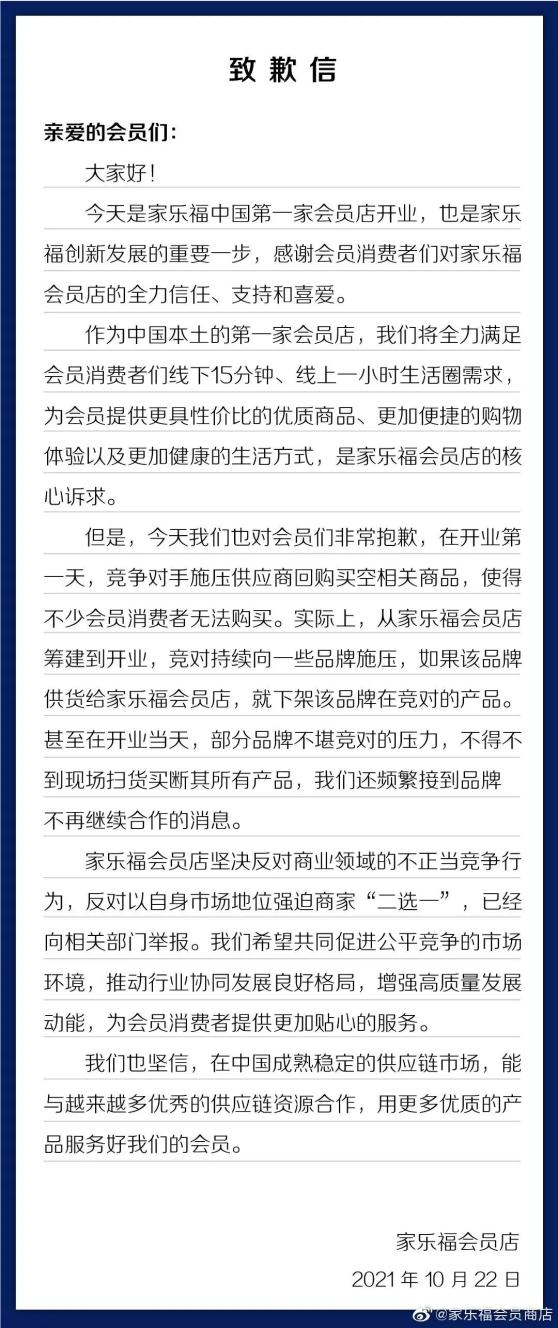 10月22日,一封致歉信,揭开了商超巨头之间的暗战。这一天,家乐福中国首家会员店在上海浦东新区正式开业。然而当天深夜,家乐福会员商店官方微博发布了一封特殊的“致歉信”。