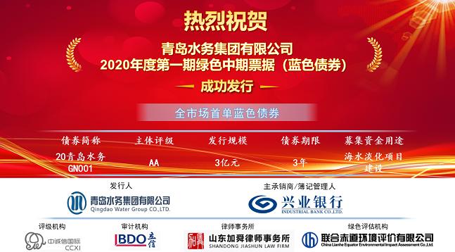 2020年11月,兴业银行青岛分行大胆探索,先行先试,联合青岛水务集团成功落地全国首单蓝色债券。