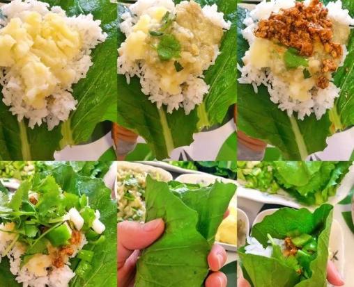 东北轻食里的主食之选,还有东北饭包。通常由白菜叶裹上二米饭(由小米和大米混合而成的饭)、土豆泥、鸡蛋酱、香葱、辣椒等后叠成长条状制成,捧在手中一口咬下去,那滋味,给个烤鸡架都不换。