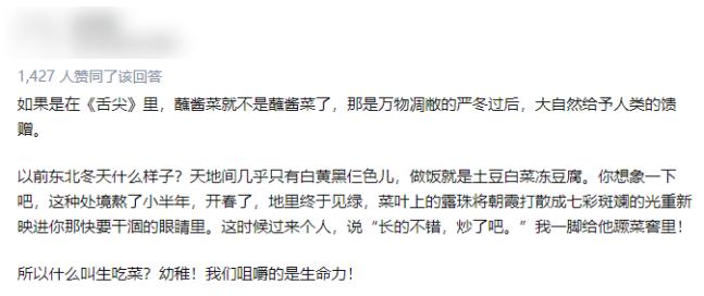 而在吃久了先前囤着的食物时难免嘴里发涩,再看到春天新长出来绿油油的新鲜蔬菜时,便不难想象东北人双眼发亮如饿狼扑食的模样了。这时候若是让他们煮着吃,可就等着被骂一句“暴殄天物”吧。