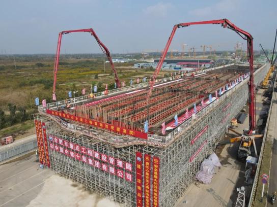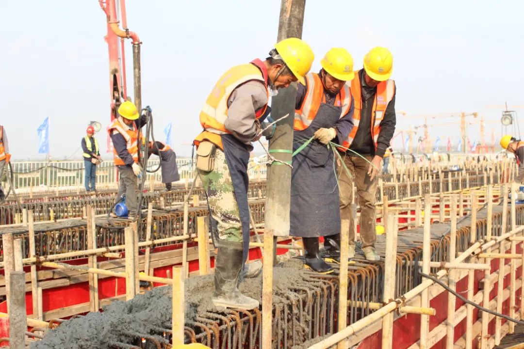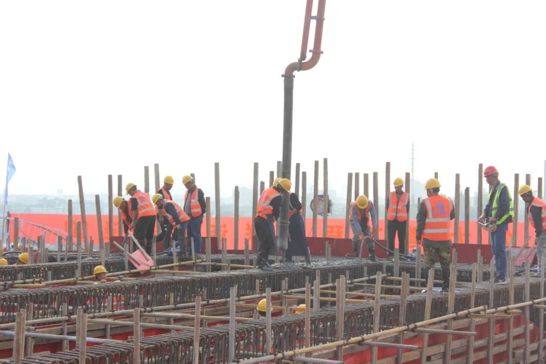 此次浇筑第96联连续梁全长96米,跨径32*3米,梁幅宽25米,高2.2米,共需浇筑1960立方米混凝土。底腹板需浇筑约1200立方米,采用C50混凝土,浇筑将持续约20小时。