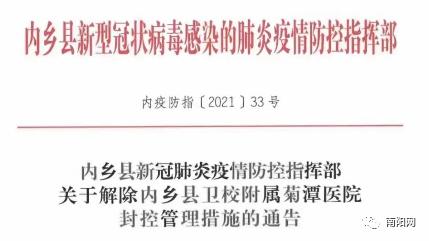 根据国务院联防联控机制《新型冠状病毒肺炎防控方案(第八版)》的规定,定于2021年10月26日18:00 解除对内乡县卫校附属菊潭医院的封控管理措施。