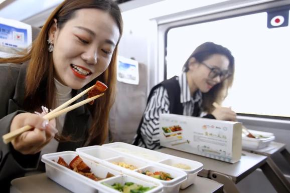 目前长三角高铁热链餐销售中,列车车厢点餐量(含餐车点餐、座椅扶手二维码点餐)与铁路12306网络订餐量比例约为10:1,大部分旅客习惯于通过现场实物点餐方式选择用餐。为了让车上旅客能享用到更多品类的美食,铁路部门优选地方特色美食品牌进站上车,把更多的地方“特色菜”送到旅客的座位上。