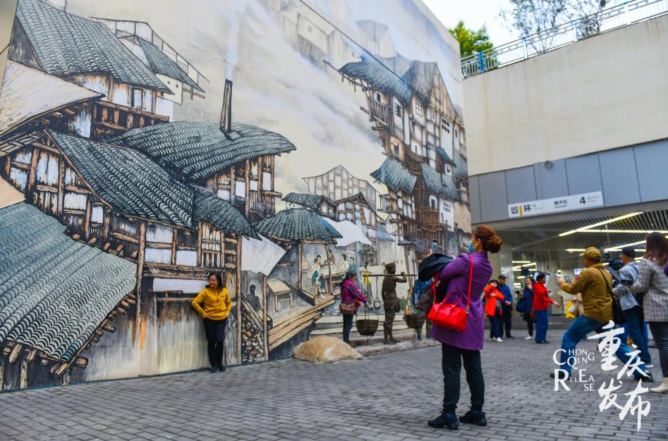 “就是这种街景,吊脚楼,小烟柜,还有挑起扁担的棒棒儿。”站在轨道交通弹子石站4号出入口的两幅巨型壁画跟前,回忆满满的蒋冬华和朋友们忍不住轮番合影。“多年前从重庆退休后还是第一次回来,感觉真的太好了,出门从坐交通车开始就想不停拍照。”