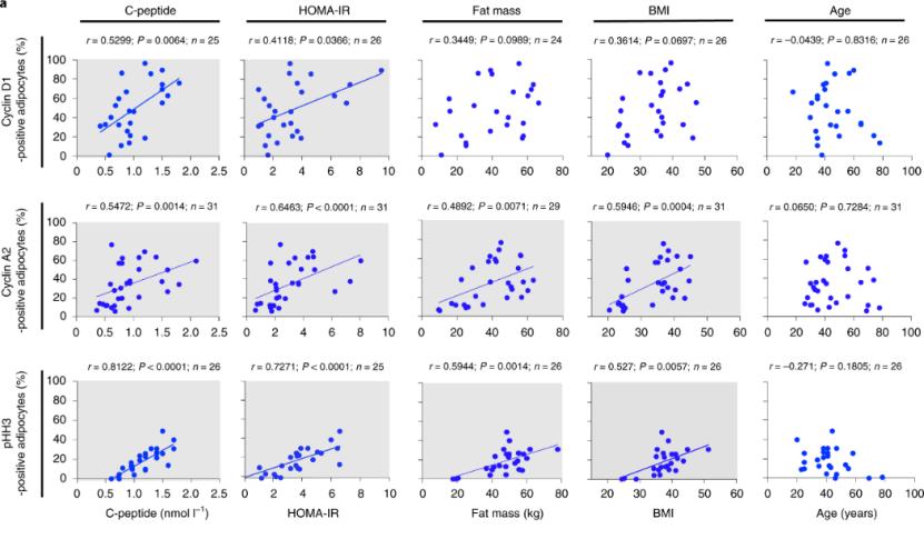 为了验证这一猜想,研究人员对受试者的临床特征(包括年龄,BMI,C肽,脂肪量,HOMA-IR等)与细胞周期标志物进行了详细分析。与预期结果相同,研究人员发现肥胖和胰岛素相关参数(C肽及HOMA-IR)与细胞周期标志物之间存在很强的相关性。