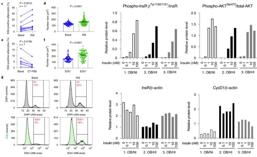研究人员又对脂肪细胞中胰岛素受体信号下游通路相关蛋白表达情况进行了验证,发现肥胖和高胰岛素血症均能激活胰岛素受体信号通路,同时,高胰胖组细胞有更高的细胞周期相关蛋白表达。