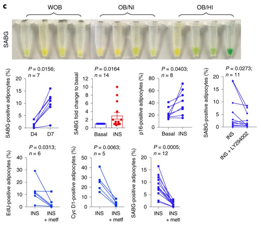为了研究这一现象,研究人员将三组受试者的脂肪细胞进行衰老相关标记染色(SABG),令人惊奇的是,不胖组与纯胖组SABG表达没有明显差异,而高胰胖组的SABG表达明显升高。这说明是人类脂肪细胞衰老可能是由于高胰岛素血症介导的,而不是因为肥胖。