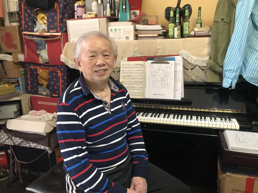 屠巴海老师家坐落在上海最热闹、最繁华的地段,老式公房,空高。搭乘改建过的绿色电梯上楼,迎面见到穿着条纹体恤的屠巴海老师,他精神矍铄、思维敏捷,哪里像近八旬的人呢。屋内铺满各式东西,钢琴上放着他新写的歌谱,高兴时弹起一首他为毛泽东的诗词《咏梅》谱写的曲。