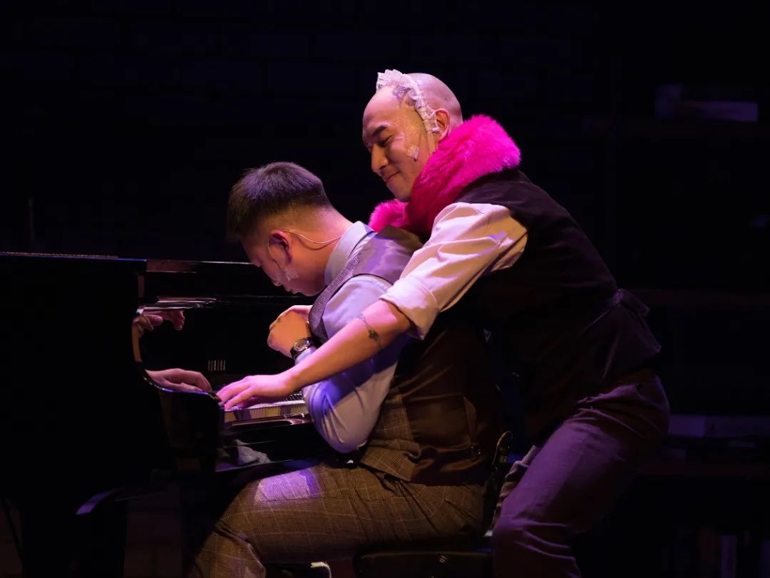 《两个人的谋杀》中文版剧本及歌词由该剧项目制作人刘雷翻译,其与时俱进、风趣幽默接地气的唱词获得了观众的一致好评;来自上海话剧艺术中心的导演田水和复排导演王海鹰的执导也令现场观众充满惊喜。而说到该剧最为精彩的一大亮点,便是两位演员边唱边跳边弹钢琴,同时以多种声音和小道具分饰多角的演绎了(点击如下链接,演员幕后故事大揭秘)。