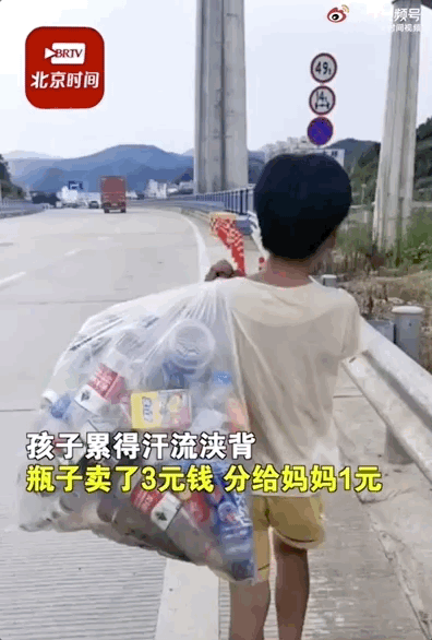 孩子累得汗流浃背,瓶子卖了3元钱。