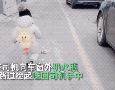 坐后座的孩子随手将酸奶盒扔出窗外,