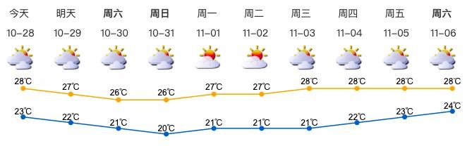 我市多云,偶有零星小雨;气温23-28℃;偏东风2-3级,沿海、高地和海区阵风6级;相对湿度55%-85%。