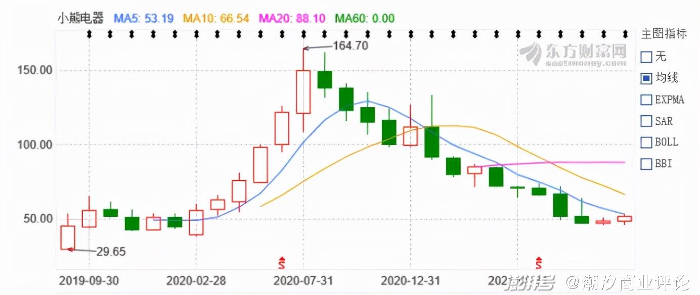 除了财报不理想之外,小熊家电的股价也持续走低。截至目前,小熊电器的股价从最高点的165/股跌至最低点的50/股左右,跌幅超60%,市值蒸发近100亿元。