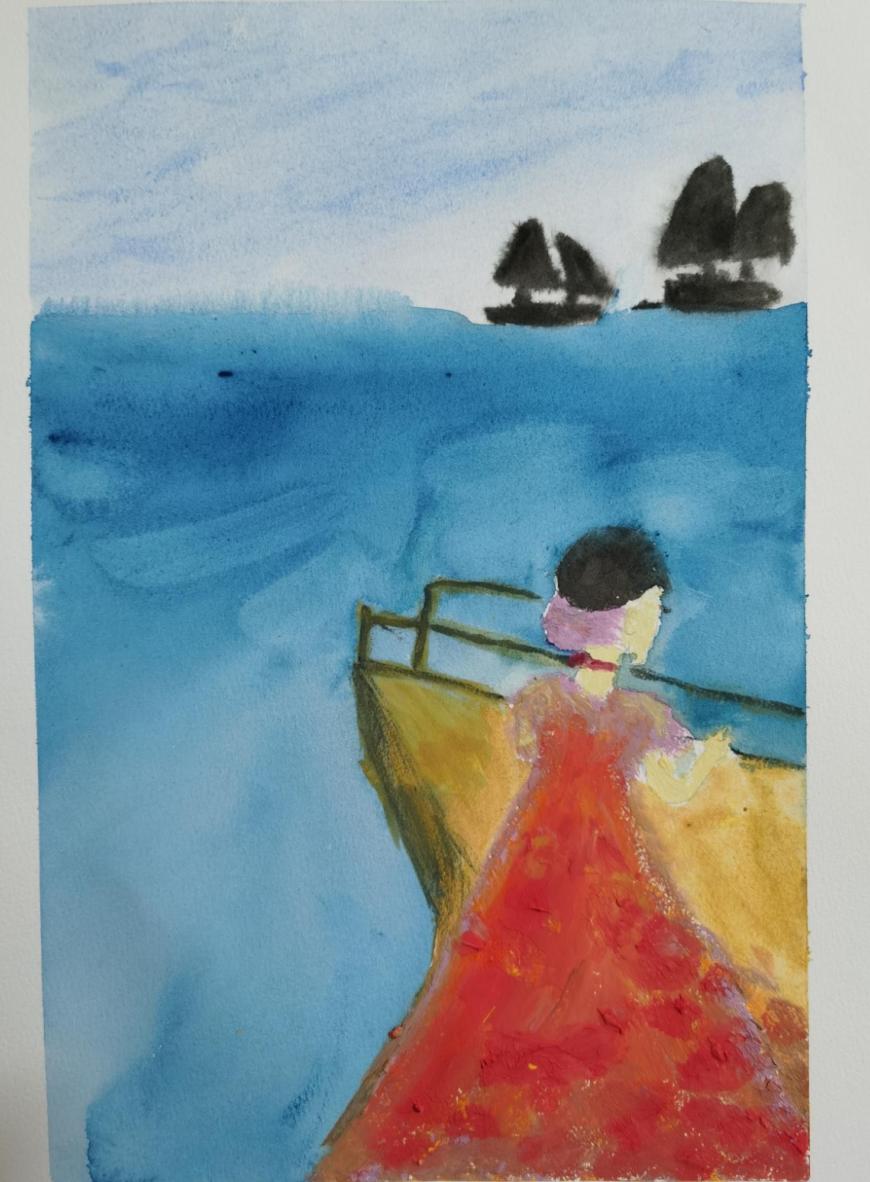 她对我说:“水一般都是象征着无意识,这幅画中面对着大海的人,似乎意味着要开始面对自己的无意识了,但这无疑是令人恐慌和害怕的,在画中远远的还有两艘船,有些单薄也有些不知所措,需要航线和引导……”。
