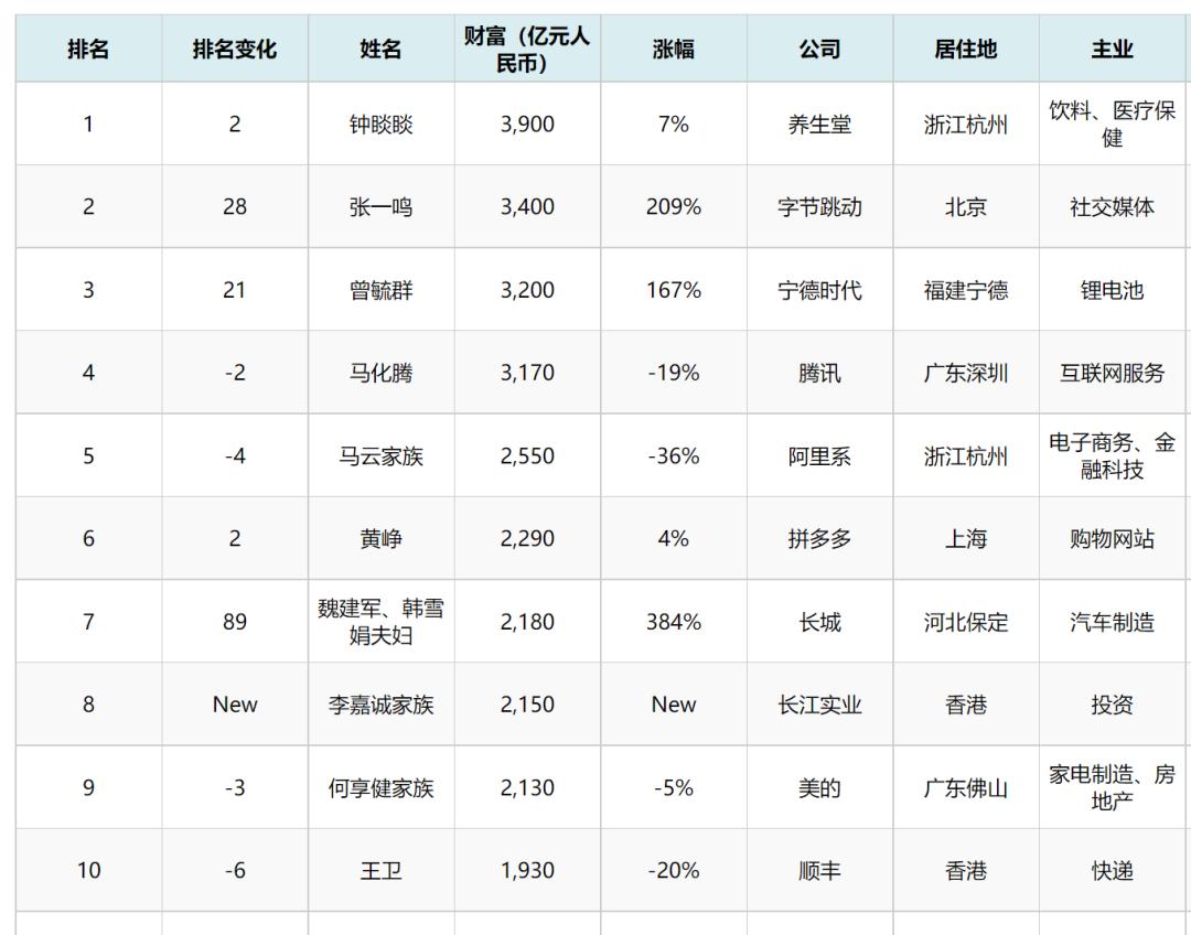 近日,2021年胡润百富榜发布,农夫山泉创始人钟睒睒、字节跳动创始人张一鸣、宁德时代创始人曾毓群取代马化腾、马云、许家印等,位居前三。