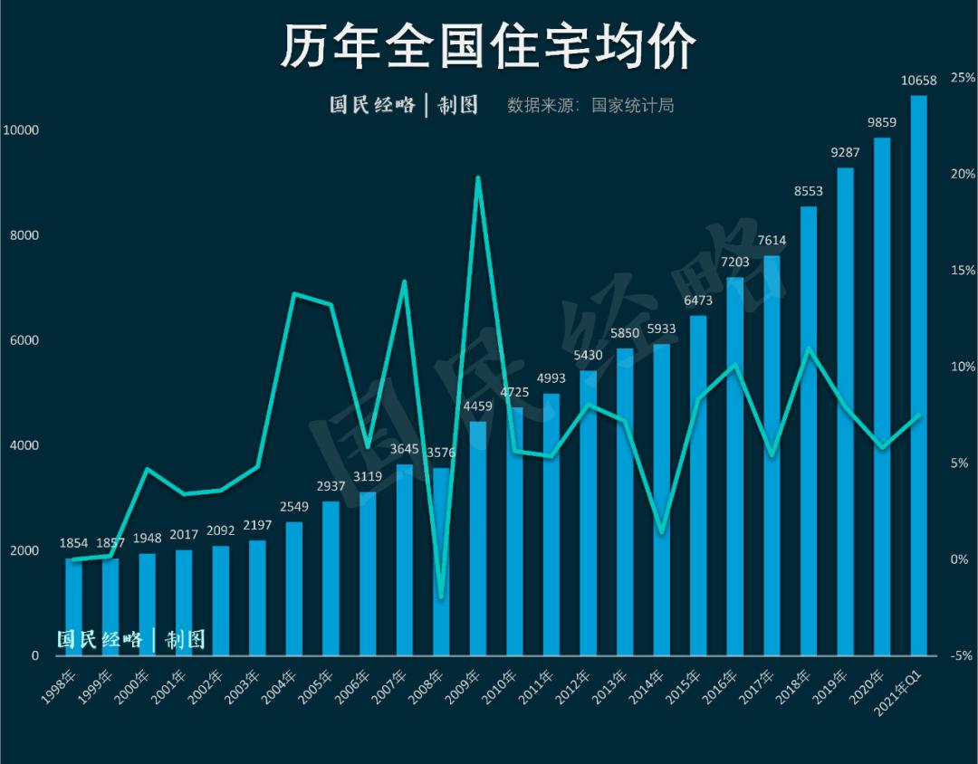 从1998年至今,全国住房均价从2000元攀升到1万元以上,涨了5倍左右;而一线城市房价则从三五千元攀升到6-10万元,涨幅高达10-15倍。