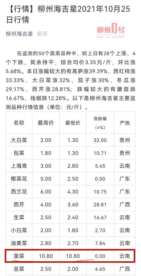 柳州海吉星发布的蔬菜价格,菠菜价格达到10.8元/斤