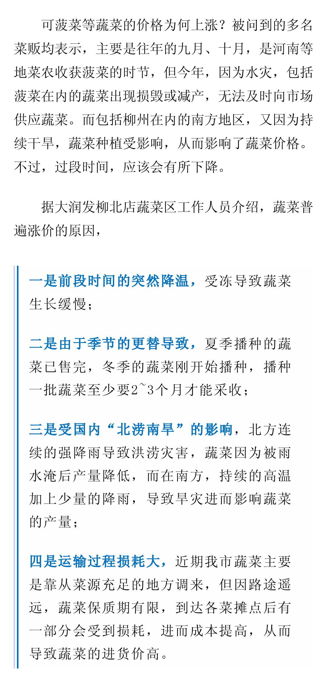白菜:平日2元/斤,如今在桂中农贸过渡菜市卖到了4元/斤,在超市则卖到了接近5元/斤,如大润发柳北店卖就到了4.98元/斤;