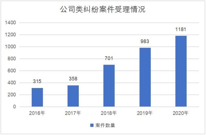 2016年至2020年,济南两级法院共审结与公司有关的纠纷案件3538件。2016年审结315件,2017审结358件,2018年审结701件,2019年审结983件,2020年审结1181件。案件数量总体呈增长趋势,总量处于高位运行状态。案件数量总体增长趋势也侧面反映了我市公司作为主要商事主体的活跃程度。