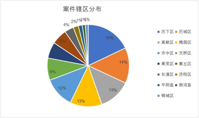 济南两级法院5年审结的3538件案中,济南中院审结874件,13个区县法院共审结2664件。各区县法院中,历下区、历城区、高新区、槐荫区、市中区法院审结案件数量位居前五,占区县法院审计案件总数的比例分别为17.94%、14%、12.65%、12.57%和12.04%。各区县法院审理案件数量与地区经济发展水平、辖区面积、人口数量、区域位置等综合因素,呈现较为明显的正向关系。纠纷数量和商事经济发展程度存在正向关系。
