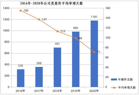案件的审理周期是司法效率的重要体现,是法治营商环境的重要一环。2016年至2020年,济南两级法院公司类纠纷案件平均审理天数101.17天。其中,2016年155天;2017年137天;2018年113天;2019年99天,2020年71天。从发展态势来看,各年度平均审理周期呈现逐年缩短趋势,审理效率逐年提高。