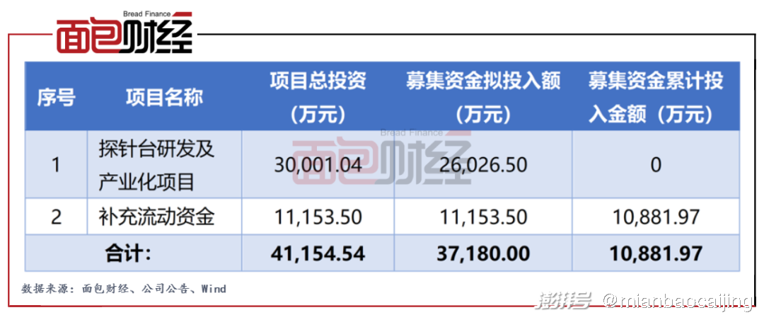 今年9月,公司以45.75元/股的价格向8个特定对象发行股票812.68万股,最终募资约3.72亿元,募资净额约3.62亿元。截至2021年10月25日,用于补充流动资金的部分基本使用完毕,探针台研发项目尚未开始投入资金。
