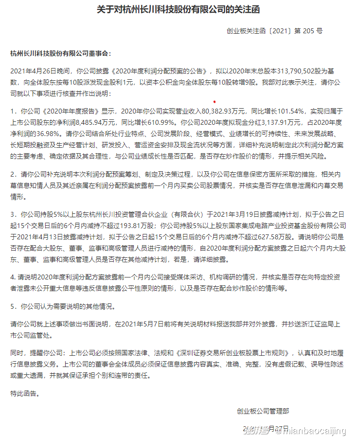 图5:长川科技2020年度利润分配预案的深交所关注函