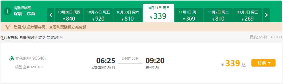 深圳至东营航线由春秋航空执飞