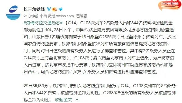 据中国铁路上海局集团有限公司官方微博消息,10月28日下午,中国铁路上海局集团有限公司接地方防疫部门协查通知,山东日照1名确诊病例曾于18日乘坐G2685次(日照至徐州)旅客列车。按照国家疫情防控要求,铁路部门将乘坐该次列车所有旅客的信息提交地方防疫部门,同时对当日值乘的所有乘务人员进行了排查和管控。其中有2名乘务人员正在G14次(上海至北京南)、G108次(嘉兴南至北京南)列车上值乘,为严防涉疫人员进京,按北京市疾控中心要求,铁路部门立即将列车就近停靠济南西站和沧州西站,配合地方防疫部门对相关乘务人员和旅客进行相应排查和管控。