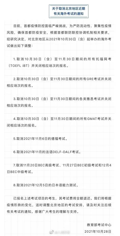 教育部考试中心28日发布通知称,首都疫情防控面临严峻挑战,经研究决定,对北京地区从2021年10月30日(含)起举办的海外考试做出如下调整。已报名考试项目的考生,考试费将全额退还。(人民日报)