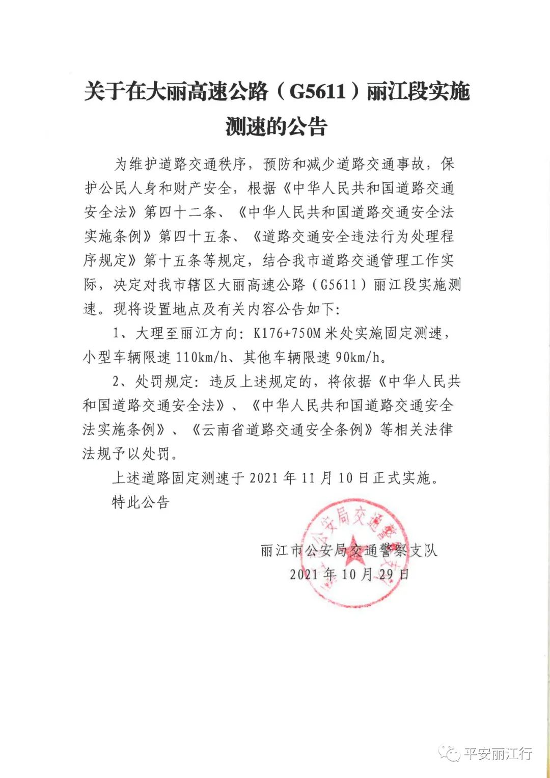 关于在大丽高速公路(G5611)丽江段实施测速的公告
