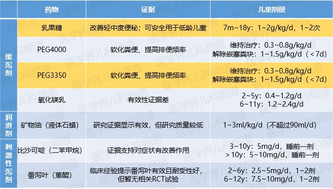 PEG不被肠道吸收,具有水结合能力,可软化大便。常用种类有PEG3350(含电解质)和PEG4000(适用于2岁以上儿童)。常用维持剂量为0.3~0.8 g/(kg·d),解除粪便嵌顿用量稍大,为1~1.5 g/(kg·d),连续使用不超过7天。
