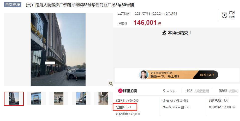 最终,禅城法院决定继续在淘宝司法网拍平台以无保留价对上述流拍商铺进行公开拍卖。这次无保留价拍卖,有194名网友设置了提醒,获得6813次围观,最终9人报名参加竞拍,经过33轮竞价,案外人陈某以最高应价14.60万元夺得涉案商铺。