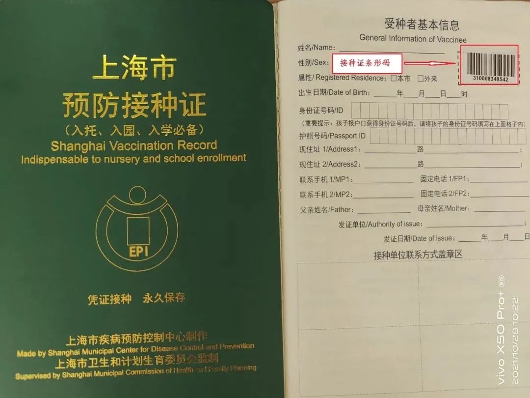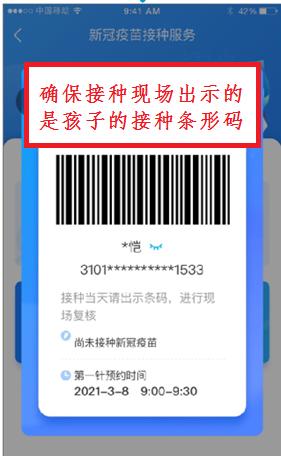 (3)接种时需家长(监护人)陪同接种,陪同人和未成年人受种者均需携带身份证或户口簿,出示孩子的“接种条码”和预防接种证。