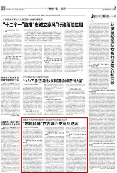 10月29日,《中国妇女报》第三版刊发《“志愿精神”在古城西安蔚然成风》一文,对西安市妇联志愿服务工作进行报道,展示了市妇联充分发挥“联”字优势,完善志愿服务机制、探索创新发展路子,用温暖的巾帼力量让越来越多的妇女儿童受惠受益的鲜活做法——