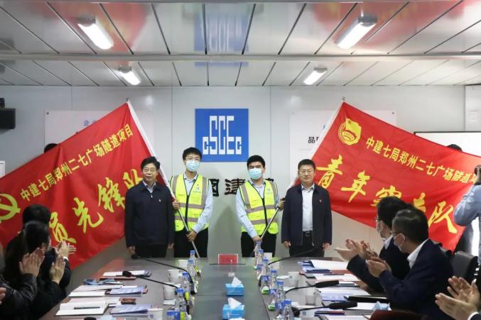 河南省住房和城乡建设厅机关党委专职副书记孟庆才,中建七局安装公司党委书记、董事长杨华斌为项目授发“党员先锋队”和“青年突击队”旗帜。