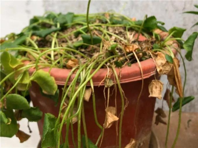 铜钱草喜温暖、喜水、喜光,冬天气温低,阳光还弱,容易黄叶、冻伤,基本就是下面这个状态,但是它的生命力很强,就算这样还没死,就是不好看,放在家里不美观。