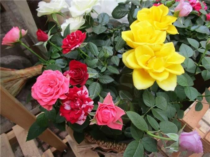到了年底,花市里都有很多小月季拼盘,一个篮子里有好几种颜色的微型月季,看起来很诱人,很多人买回去花还没开完就死了,想养活还是有一定难度的。