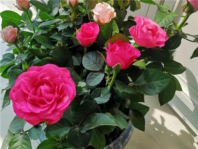 这种开满花的小月季,都是大棚里精心养护出来的,回家后环境突然变化,千万别折腾它,不要换盆、更不能换土,先放到散光角落,不要被阳光暴晒,土是湿的别浇水,等干了再浇。