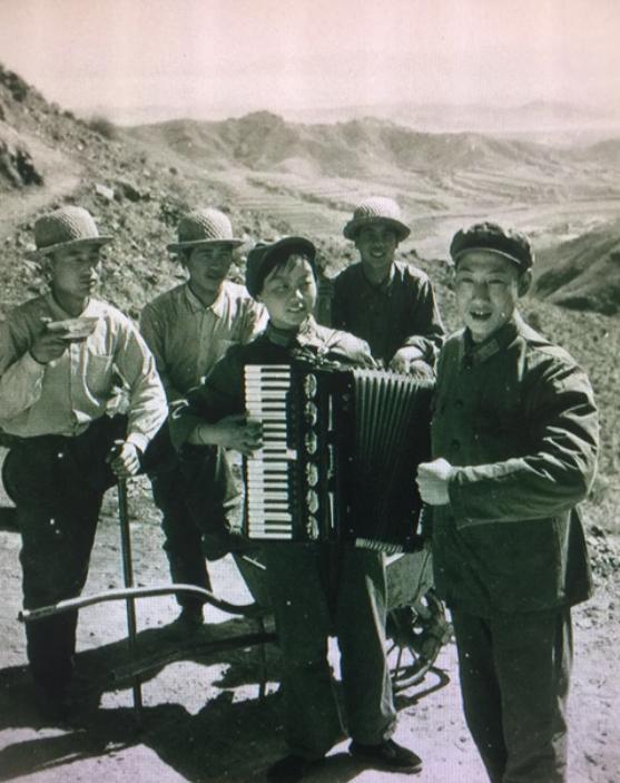 上世纪70年代初,193师(前身为红一师)文艺宣传队在坑道口为执行战备施工任务的指战员作慰问演出(佚名 摄)