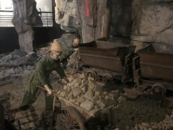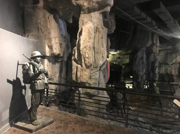 穿过梦幻隧道,一片繁忙的筑路场景造型呈现在我们眼前:身着军装、扎着腰带、戴着竹盔的铁道兵战士们拉着斗车,推着“猴儿车”,举着电钻、铁锤、铁铲,紧张而有序地建设着成昆铁路,极具年代感。我注意到,这个空间如同施工隧道里的作业面,顶部一块块巨石龇牙咧嘴,仿佛随时都要垮塌下来。当年铁道兵有许多官兵就伤残甚至牺牲于这样的“血盆大口”之中。这种场景,使参观者们一进入铁道兵博物馆就会产生强烈的心灵震撼。同路的女士们屏住呼吸,尽量控制住内心的惊诧。