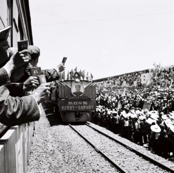 1959年2月20日,毛泽东、周恩来、陈云、彭德怀、陈毅等中央领导接见铁道兵积极分子代表大会全体代表(罗梅 摄于铁道兵博物馆)