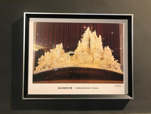 中国赠给联合国的大型象牙雕刻《成昆铁路》(罗梅 摄于铁道兵博物馆)
