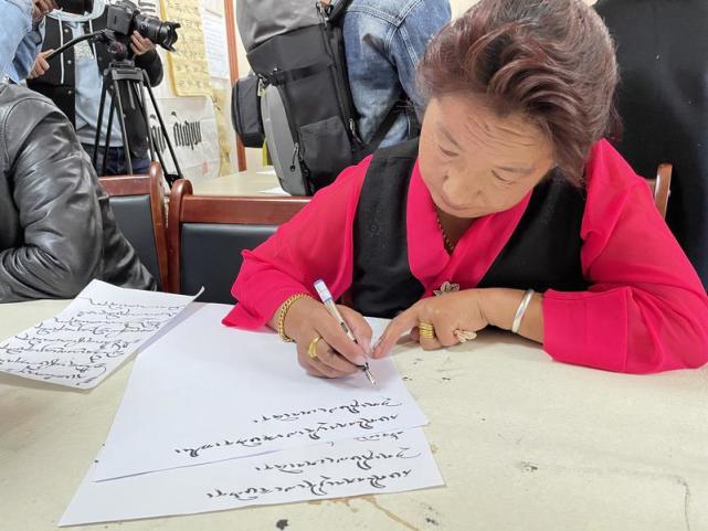 今年50岁的穷达是蔡村四组的村民,她自幼喜爱书法却苦于无人教授。2019年,拉萨市城关区开展“新时代文明实践站·一村一特色文化品牌村(社区)创建活动”,蔡村将“书法”定为本村的文化特色。同年6月,拉萨市文联、拉萨市书法家协会授予蔡村“书法村”荣誉称号。为了进一步普及书法文化,蔡村建立了新时代文明实践站书法活动室,并迎来了第一批书法爱好者,穷达就是其中之一。经过两年多的刻苦钻研,她已经写得一手漂亮的藏文书法。