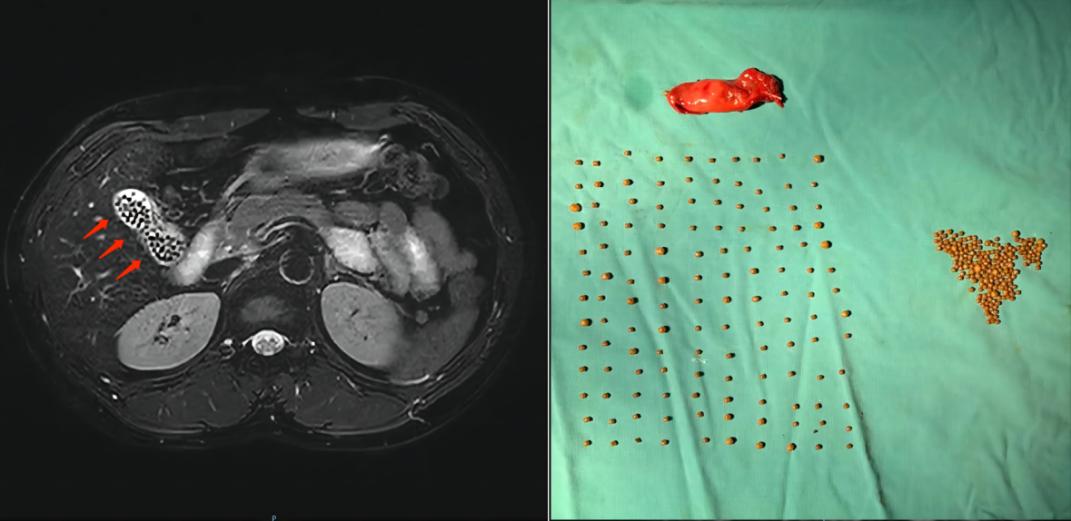 31岁男性,体检发现胆囊多发结石来门诊就医,寻求药物治疗或保胆取石手术,经专科医生详细分析利弊,最终选择腹腔镜手术切除胆囊,切除的胆囊内发现数百颗小结石,术后第二天顺利出院。