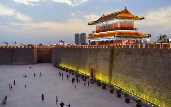 随着夜幕降临,河北正定古城南城门亮起霓虹灯。来源:新华社