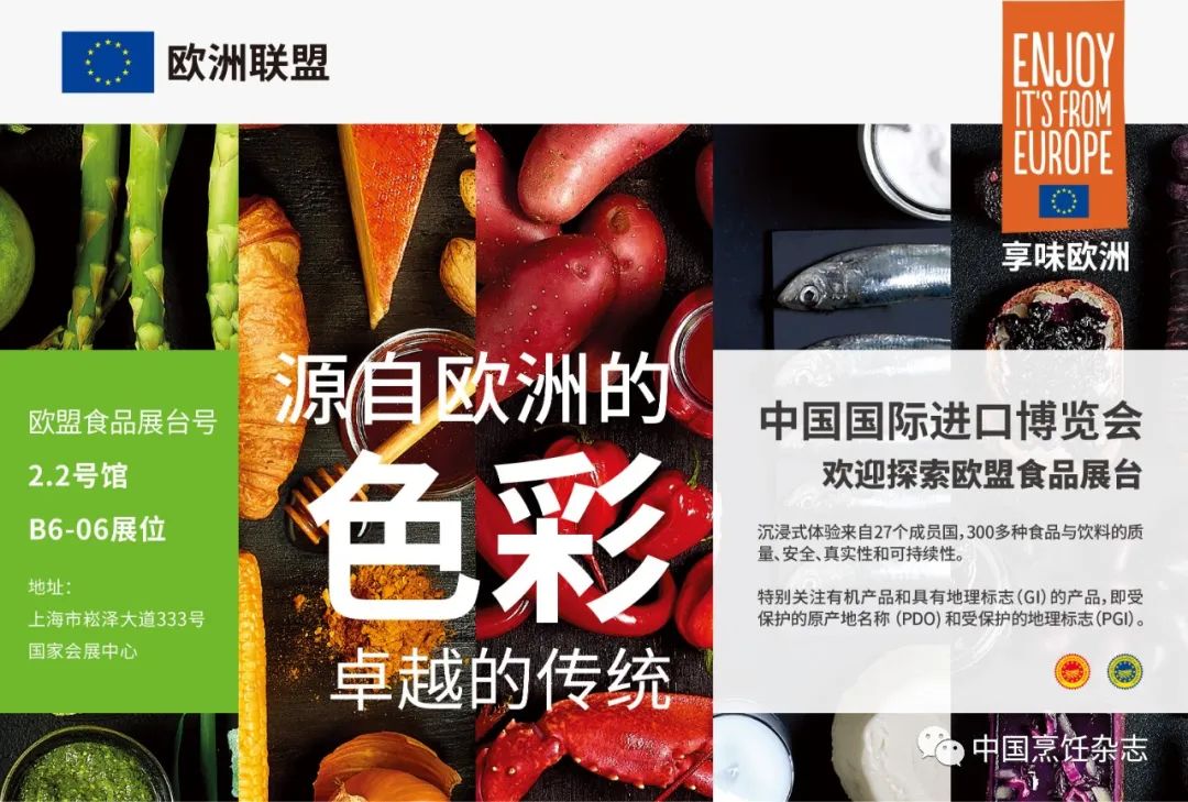 2021年中国国际进口博览会在上海国家会展中心举办之际,欧盟在欧盟食品展台即2.2号馆B6-06展位诚挚欢迎参观者的到来。