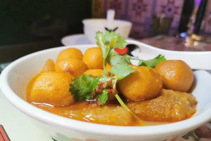 旺角街头小吃咖喱猪皮萝卜鱼蛋,这家店里也有,这道菜配料十足,鱼蛋Q弹爽滑,有回弹的感觉,肉皮里有咖喱的香味,萝卜则煮得软糯香甜,入口即化。